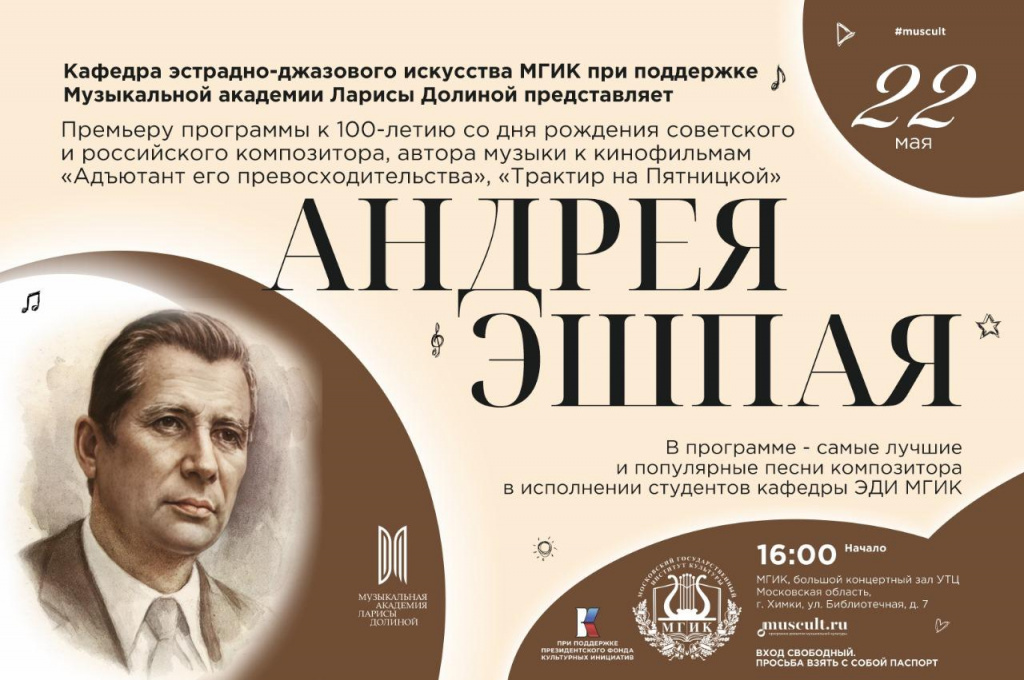 В программе концерта студенты кафедры эстрадно-джазового искусства (ЭДИ) МГИК представят лучшие произведения Эшпая, раскрывая многогранность его таланта. Ведущий вечера Дмитрий Юдин проведёт зрителей через ключевые страницы биографии композитора, напомнив о его значимом вкладе не только в музыку, но и в общественную жизнь, педагогику и сохранение исторической памяти.